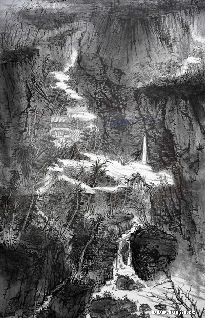 李彦锋的山水喜欢从宋元取法,以宋代的石法、树法为基,充盈于清旷的精神意蕴,附以稍嫌繁复的渲染。所完成山水既气象雄伟,浑厚华滋,又不失空灵率真,简洁明快。彦锋对山水的“形”是非常重视的,他的山水之形,不是山水、花鸟画表面的对角线构图或者其他什么的造型,而是利用西方现代理论,将西方现代大师的法则灵活转化到山水的构成上。显然西方的构成几乎都是诸如风格派、立体派、抽象派的结构法则,生搬硬套西方的构成法则肯定是会僵化的、生硬的..