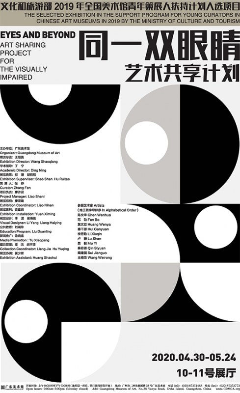 “同一双眼睛:艺术共享计划” 由广东美术馆自主策划,是文化和旅游部2019年全国美术馆青年策展人扶持计划入选项目。该项目尝试达成当代艺术的共享,共享的目标群体是普通健全观众,以及有视觉障碍的残障人士。我们一直视视觉障碍为视觉艺术、甚至艺术接受的屏障。该展览的策划源头的确是为视障观众而起,但我们并没有把该展览的受众局限于这部分特定人群,展览希望尽力做到的是:于此项目之中,视障观众能“看”到的,健全观众也能“看”到;健全观众能“看”到的,视听障观众也能“看”到。至此,我们会萌生一个更有趣的设定:视听障观众“看”不到的,健全观众也无法从这个展览上“看”得到——这便在有限的观展时间和有限的展厅容积里策略性地实现了短暂的“平等”——这是一种生理和物理上的公平,我们希望利用艺术的理想世界制造这种罕见的瞬间,跨越身体机能上的差异,通过艺术之可能性,相互体谅,相互拥抱。展览寄希望于通过艺术告知差异的存在,试图启发承认、启发理解、启发包容,而非消解差异的。